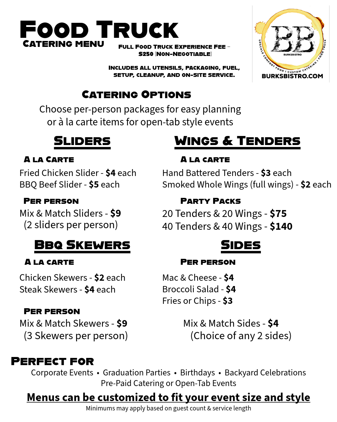 Offering Food Truck Catering, drop-off catering, buffet-style service, or plated meals to suit your event's format and style.